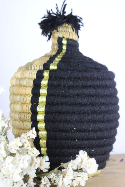 - Magnifique corbeille en osier, elle est en partie recouverte de laine et de fil doré aux détails raffinés entièrement réalisée à la main