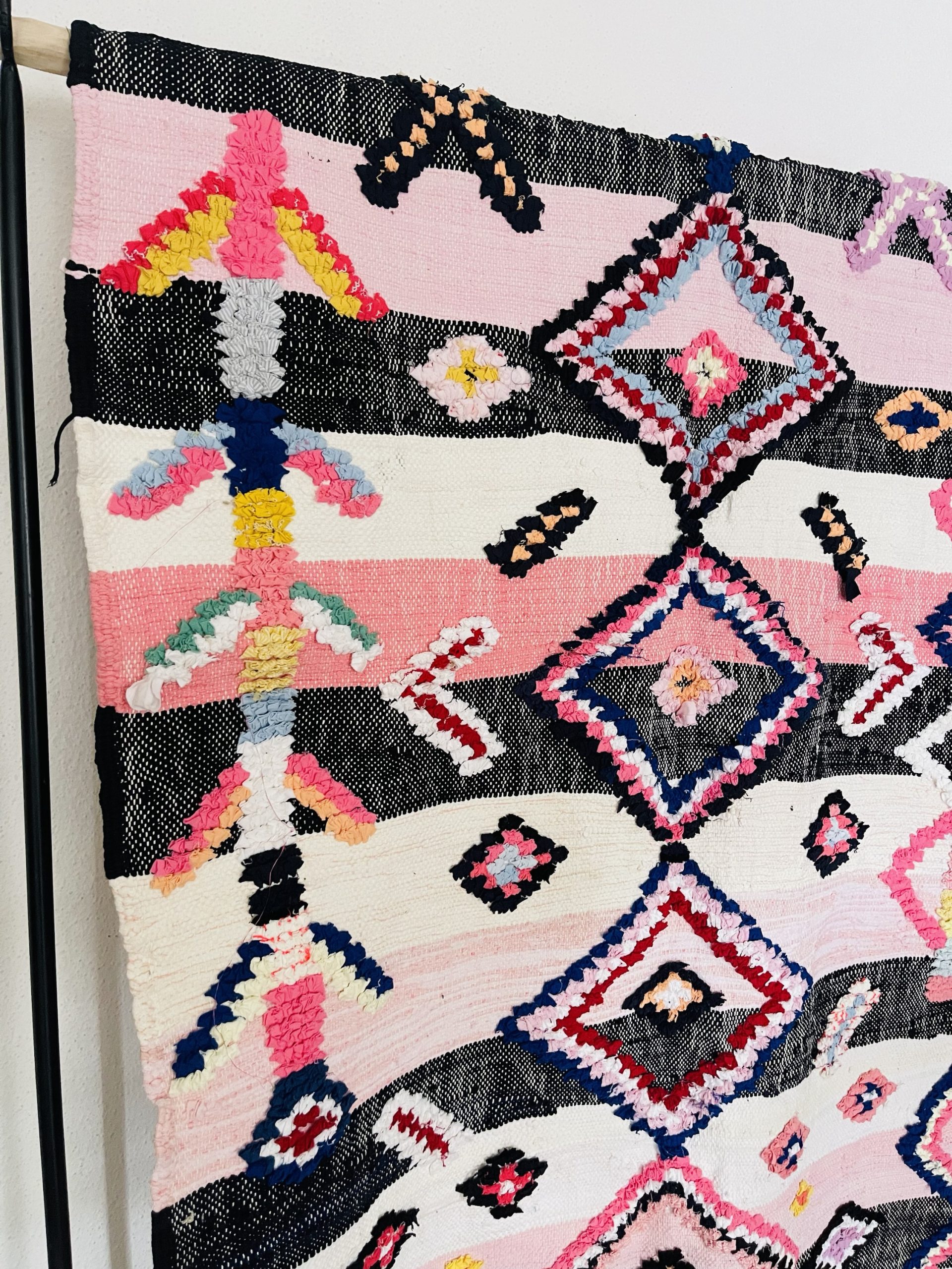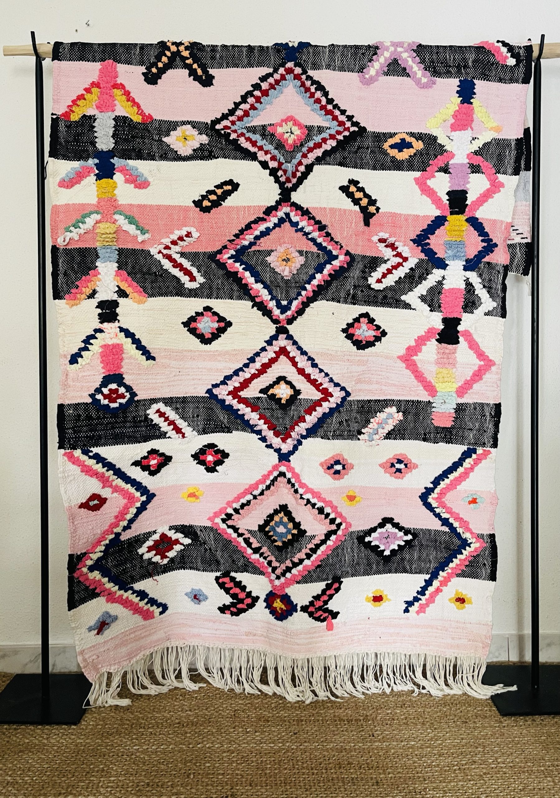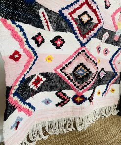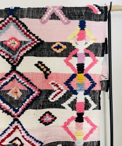 Pièce coup de cœur Cel’Souk, dans les tons roses ainsi que ses motifs.Tapis unique et très original. Très décoratif il se mariera parfaitement dans un intérieur contemporain.