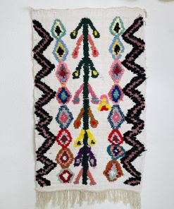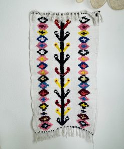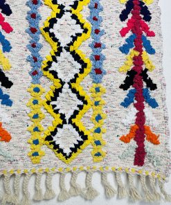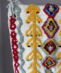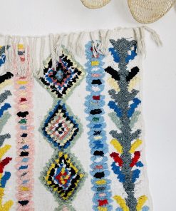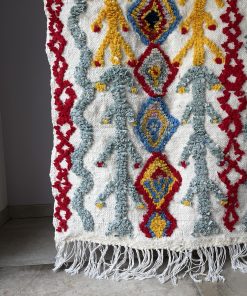 Pièce coup de cœur Cel’Souk, observez ses couleurs dans les tons de gris bleu et de jaune ainsi que ses motifs.Tapis unique et très original. Très décoratif il se mariera parfaitement dans un intérieur contemporain.