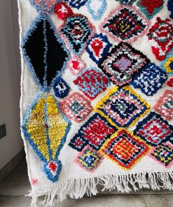 Pièce coup de cœur Cel’Souk, observez ses couleurs ses nombreux motifs colorés. Tapis unique et très original. Très décoratif il se mariera parfaitement dans un intérieur contemporain.