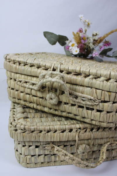 •  Jolie valise de rangement en feuille de palmier traditionnelle marocaine agrémentée d’une poignée ainsi que d’un système de fermeture elle est réalisée entièrement de façon artisanale dans l’atelier du maitre Vannier Rahal